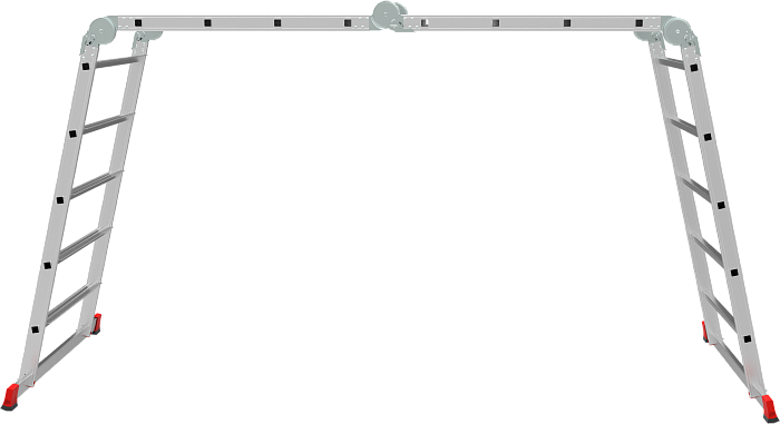 Профессиональная многофункциональная шарнирная лестница "4 в 1": приставная, Г-образная с опорой на стену, двухсторонняя стремянка, помост с широкими ступенями на подъёмной секции. Больше пространства для свободы перемещений. Используется как рабочий стол.