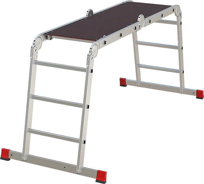 Профессиональная многофункциональная шарнирная лестница "4 в 1": приставная, Г-образная с опорой на стену, двухсторонняя стремянка, помост со съёмным настилом в комплекте. Увеличенная ширина для свободы перемещений.