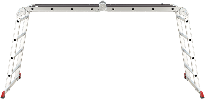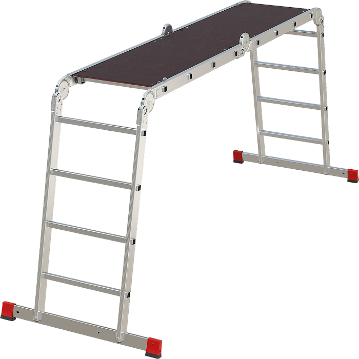 Профессиональная многофункциональная шарнирная лестница "4 в 1": приставная, Г-образная с опорой на стену, двухсторонняя стремянка, помост со съёмным настилом в комплекте. Увеличенная ширина для свободы перемещений.