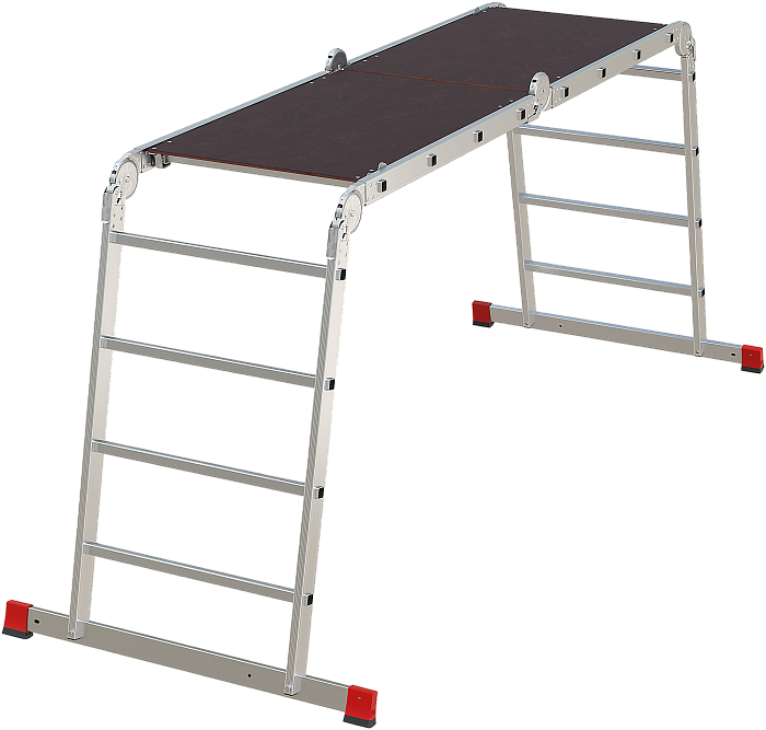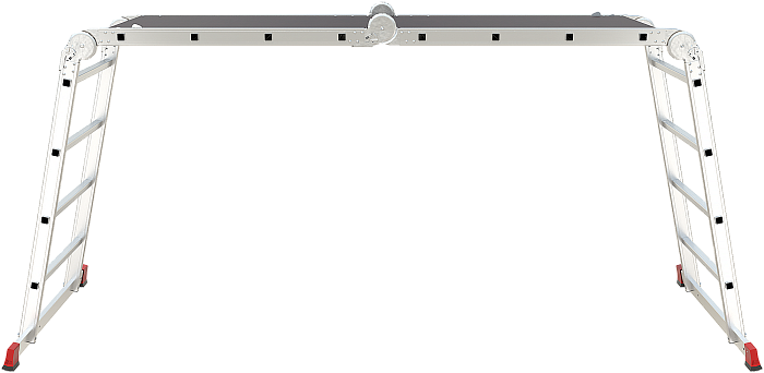 Профессиональная многофункциональная шарнирная лестница "4 в 1": приставная, Г-образная с опорой на стену, двухсторонняя стремянка, подмости, помост со съёмным настилом в комплекте. Больше пространства для свободы перемещений.