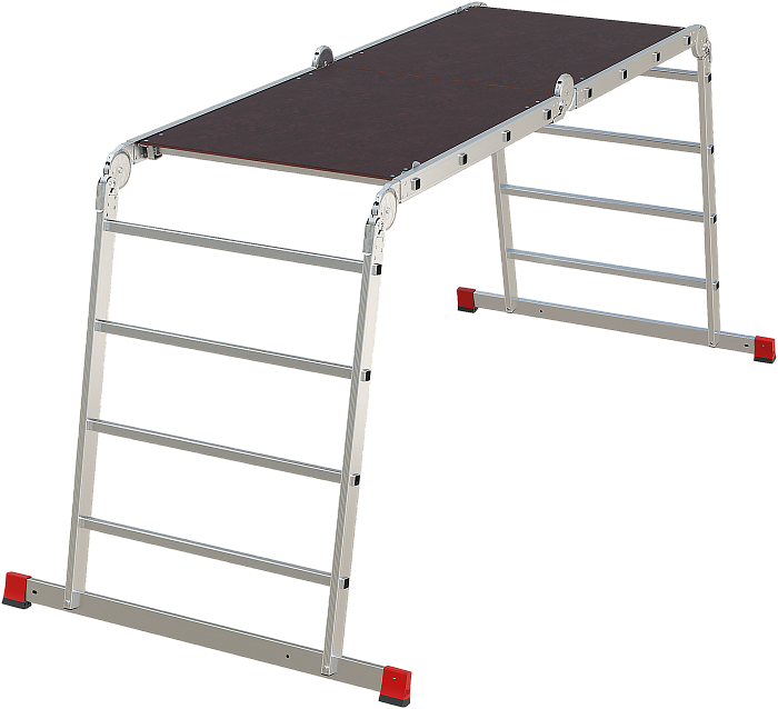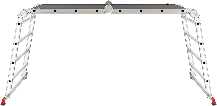 Профессиональная многофункциональная шарнирная лестница "4 в 1": приставная, Г-образная с опорой на стену, двухсторонняя стремянка, помост со съёмным настилом в комплекте. Больше пространства для свободы перемещений. Используется как рабочий стол.