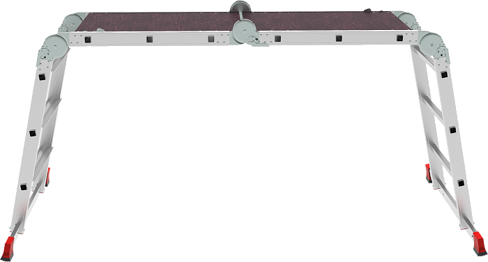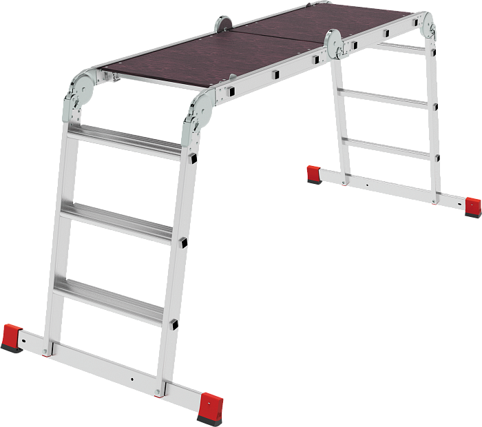 Профессиональная многофункциональная шарнирная лестница "4 в 1": приставная, Г-образная с опорой на стену, двухсторонняя стремянка, помост с широкими ступенями на подъёмной секции и со съёмным настилом в комплекте. Увеличенная ширина для свободы перемещений.
