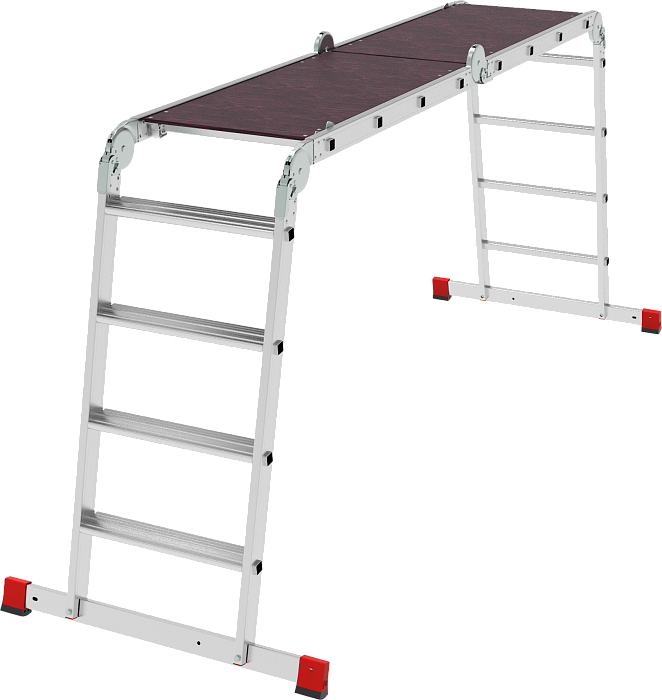 Профессиональная многофункциональная шарнирная лестница "4 в 1": приставная, Г-образная с опорой на стену, двухсторонняя стремянка, помост с широкими ступенями на подъёмной секции и со съёмным настилом в комплекте. Увеличенная ширина для свободы перемещений.
