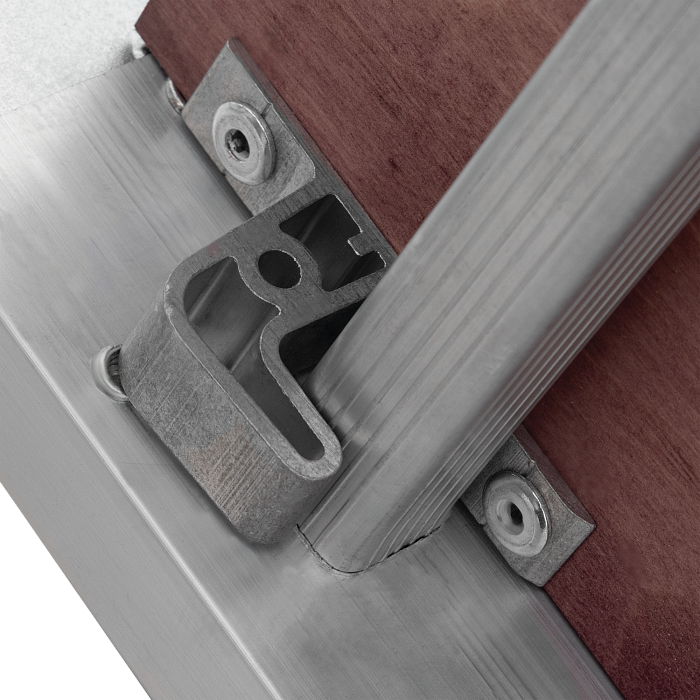 - Рифлёные развальцованные ступени 80 мм (евростандарт) с жёстким алюминиевым профилем в основании на одной секции – удобный подъём в положении «Помост».