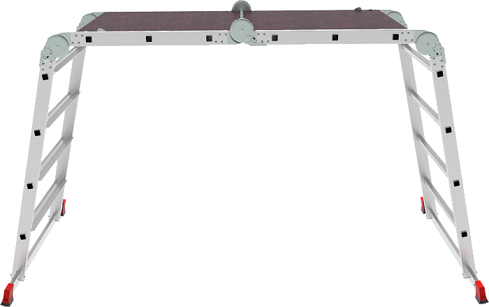 Профессиональная многофункциональная шарнирная лестница "4 в 1": приставная, Г-образная с опорой на стену, двухсторонняя стремянка, помост с широкими ступенями на подъёмной секции и со съёмным настилом в комплекте. Больше пространства для свободы перемещений. Используется как рабочий стол.