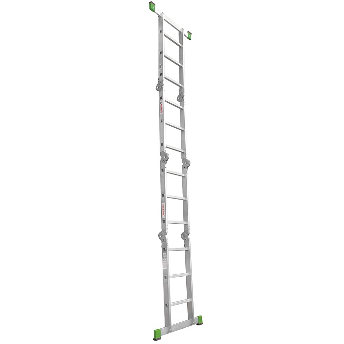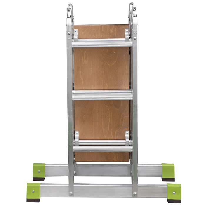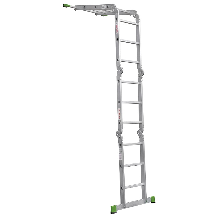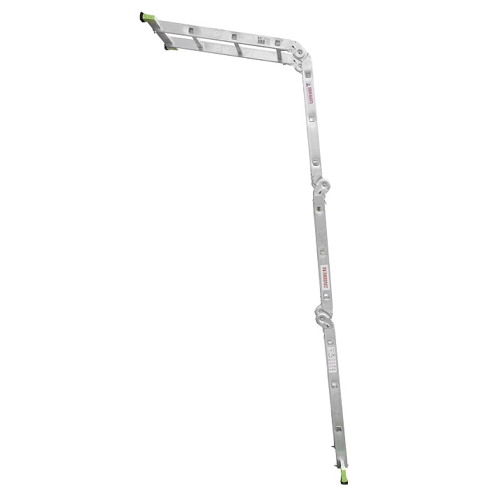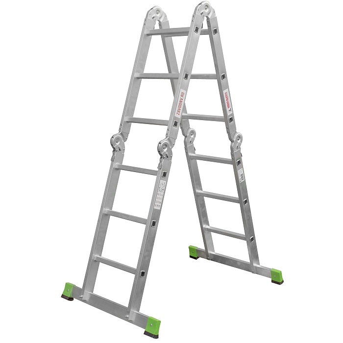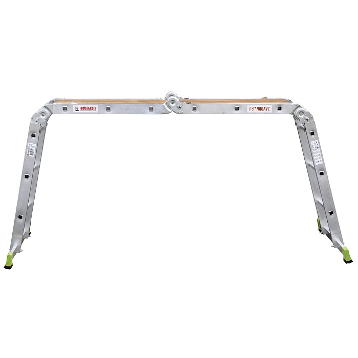 Многофункциональная улучшенная шарнирная лестница «4 в 1»  увеличенной ширины для универсального использования с повышенными нагрузками: приставная, Г-образная с опорой на стену, двухсторонняя стремянка, помост со съёмным настилом.