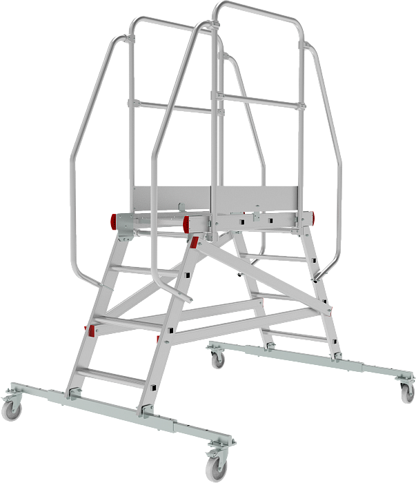 Двухсторонняя лестница с широкой платформой и поручнями. Телескопические траверсы. Максимальная нагрузка 150 кг. Гарантия 5 лет.