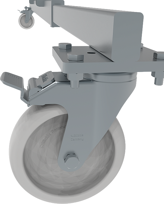 - 2 поворотных колёсных опоры 125х30 мм с фиксацией угла поворота и тормозом.