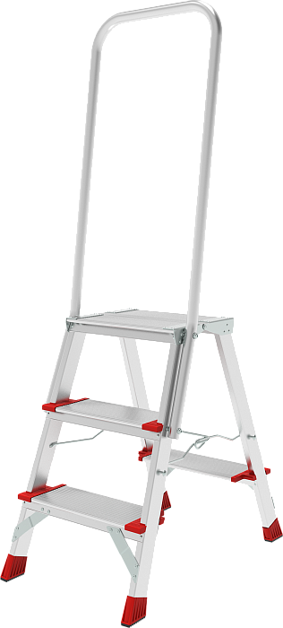 Высокопрочная стремянка с увеличенным радиусом работы и точкой опоры под рукой. Широкие ступени снижают утомляемость и повышает производительность.