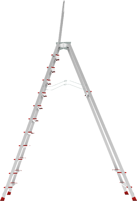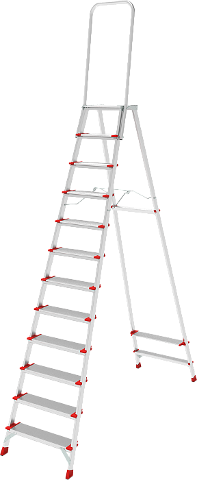 Высокопрочная стремянка с увеличенным радиусом работы и точкой опоры под рукой. Широкие ступени снижают утомляемость и повышает производительность.