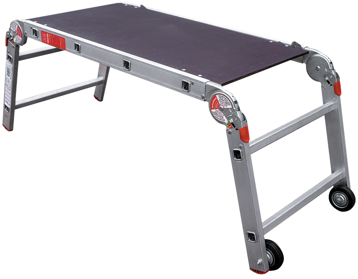 Складные профессиональные строительные подмости "3 в 1" для коллективных работ, требующих большой площадки. Помост со съемным настилом, приставная и Г-образная лестница с опорой на стену.