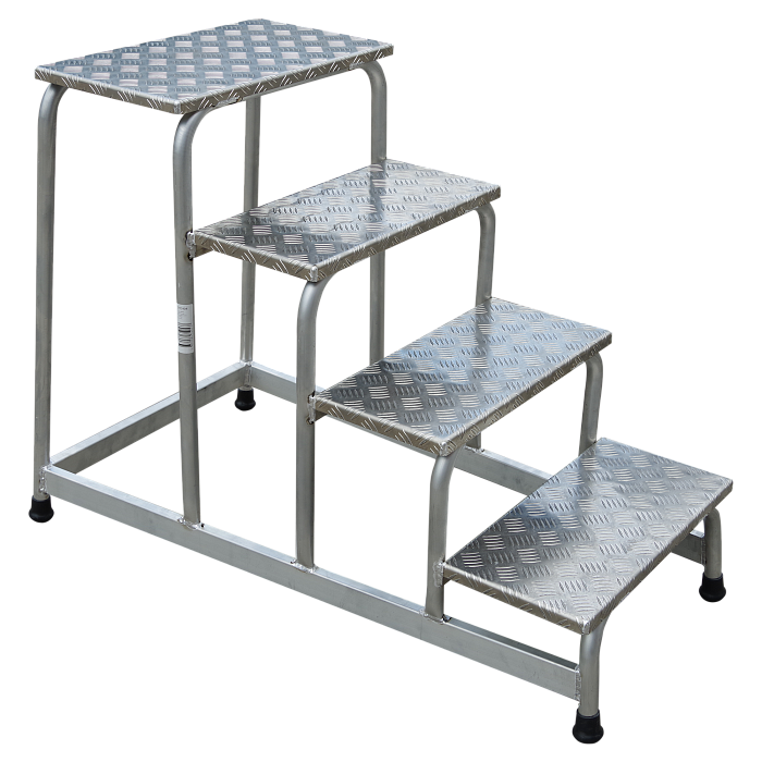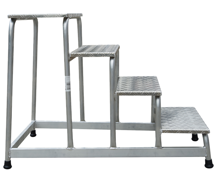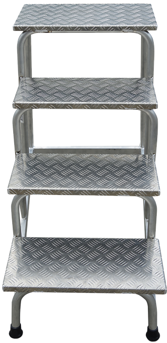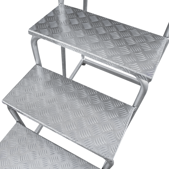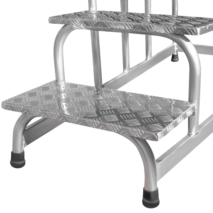 - Широкие ступени — площадки 240 мм из рифлёного алюминиевого листа для надёжного сцепления.