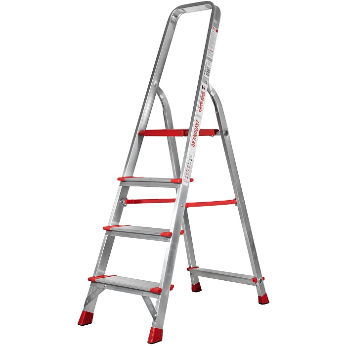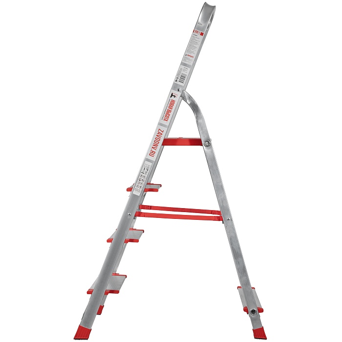 Высокопрочная лёгкая стремянка с глубокими ступенями 130 мм, цельнотянутой стальной площадкой и высокой дугой безопасности.
