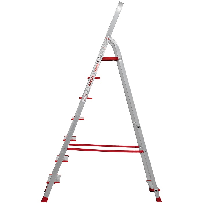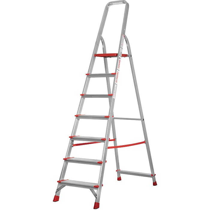 Высокопрочная лёгкая стремянка с глубокими ступенями 130 мм, цельнотянутой стальной площадкой и высокой дугой безопасности.