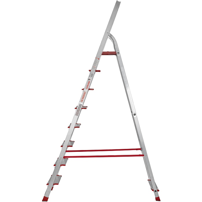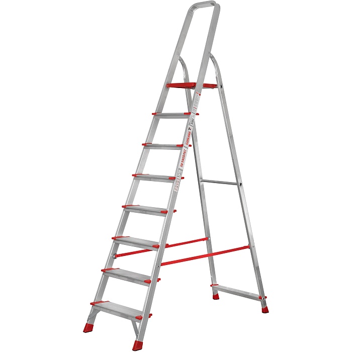 Высокопрочная лёгкая стремянка с глубокими ступенями 130 мм, цельнотянутой стальной площадкой и высокой дугой безопасности.