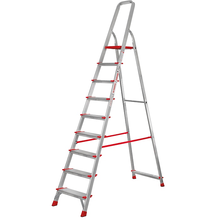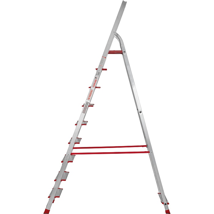 Высокопрочная лёгкая стремянка с глубокими ступенями 130 мм, цельнотянутой стальной площадкой и высокой дугой безопасности.