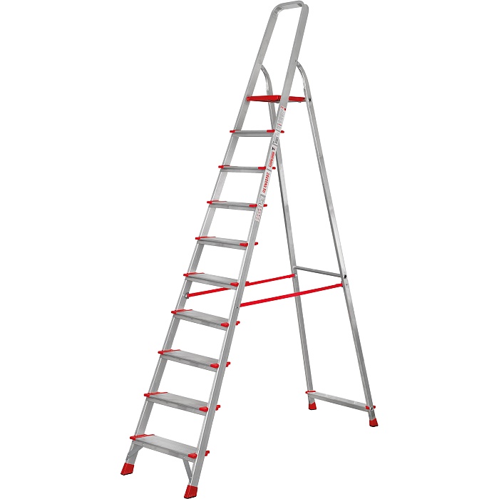 Высокопрочная лёгкая стремянка с глубокими ступенями 130 мм, цельнотянутой стальной площадкой и высокой дугой безопасности.