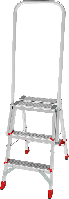 Высокопрочная стремянка с увеличенным радиусом работы и точкой опоры под рукой.