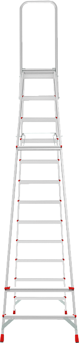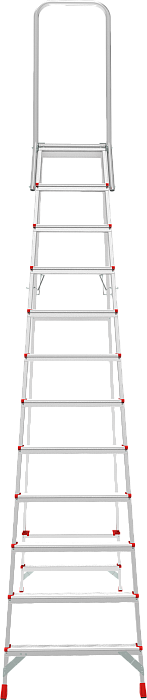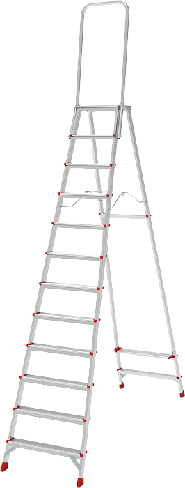 Высокопрочная стремянка с увеличенным радиусом работы и точкой опоры под рукой.