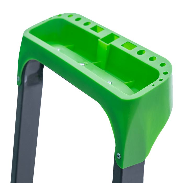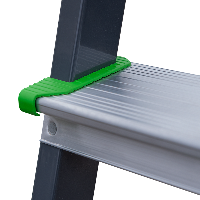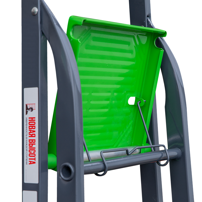 Усиленная стремянка для бытовых работ с органайзером, цельнотянутой стальной площадкой, высокой дугой безопасности и ступенями глубиной 80 мм.