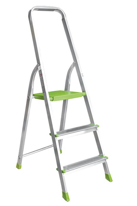 Усиленная стремянка с цельнотянутой стальной площадкой, высокой дугой безопасности и ступенями глубиной 80 мм.