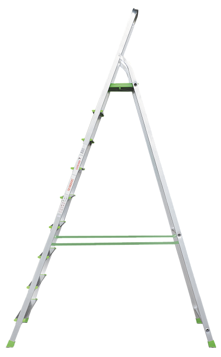 Усиленная стремянка с цельнотянутой стальной площадкой, высокой дугой безопасности и ступенями глубиной 80 мм.