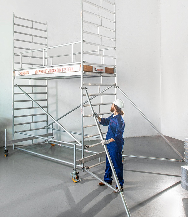 Собираются одним человеком и предоставляют просторную рабочую зону для двоих на высоте более 9 м. Пример вышка 74411
